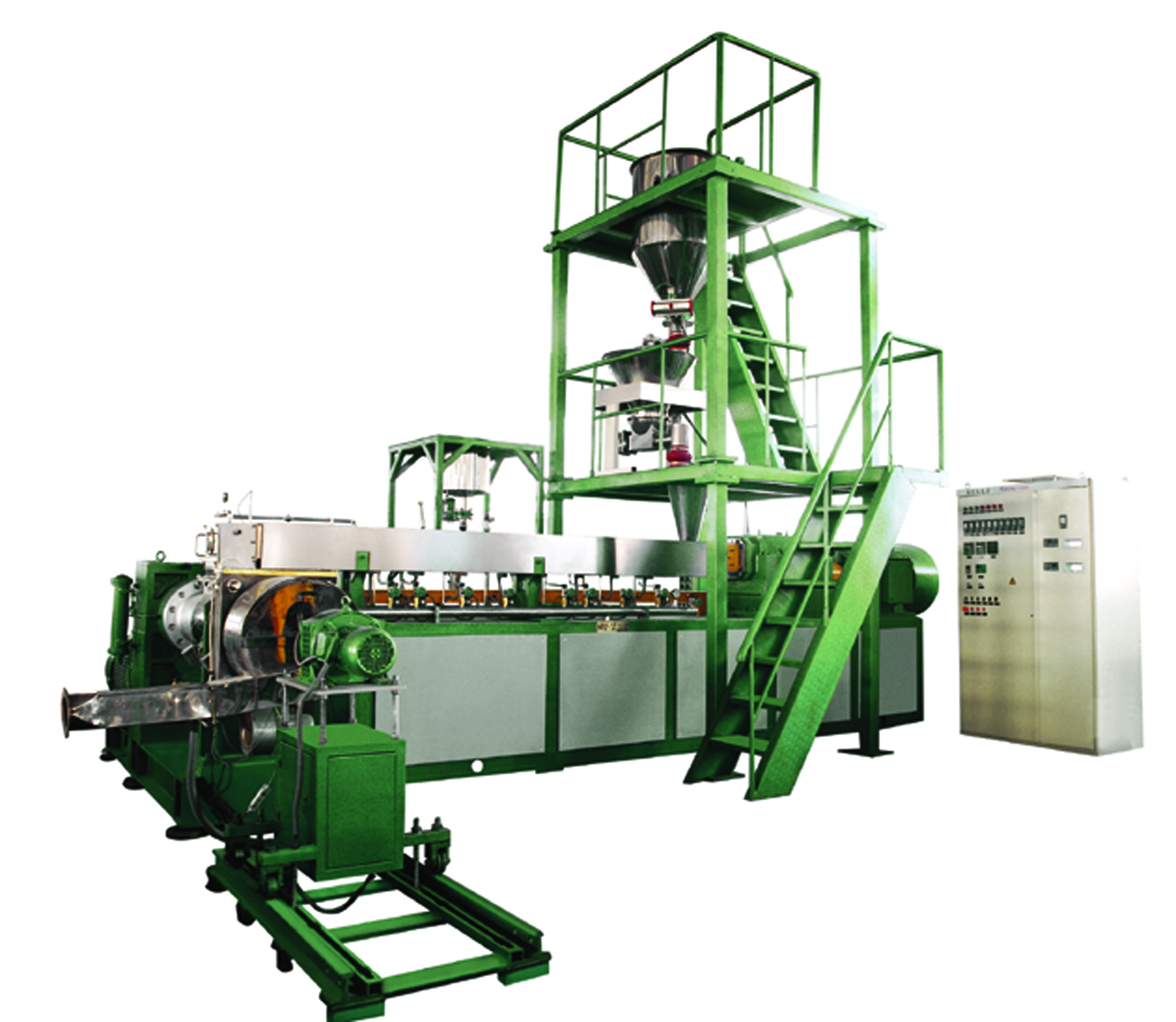 設備主要由1 計量喂料機2 雙螺桿擠出機3 排氣室4手動或液壓換網5熱切機頭6水環切粒機7離心脫水機8風機9旋風料倉組成。